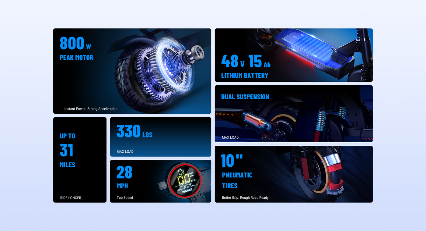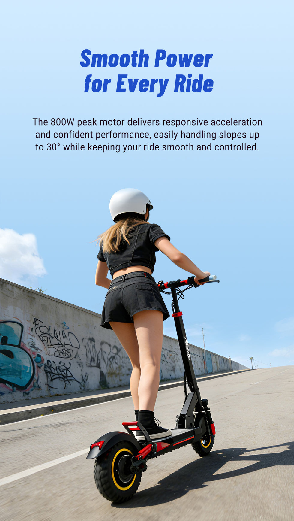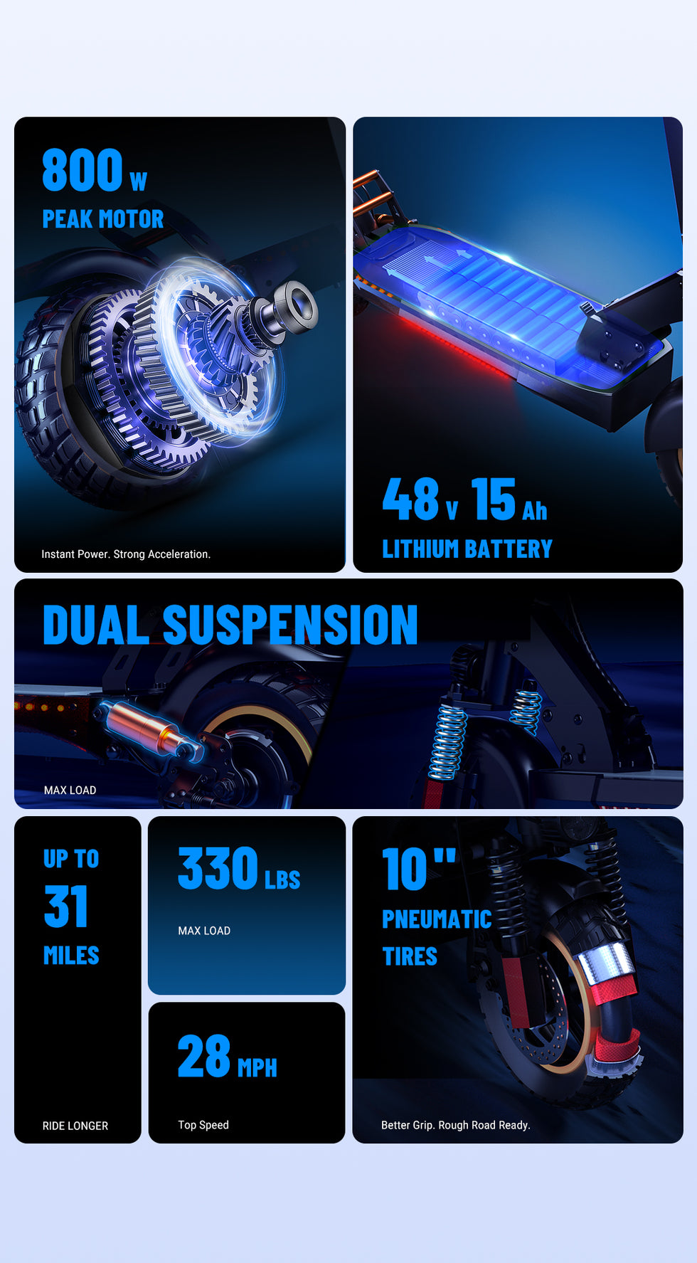 800W Motor & 10Ah Lithium Battery: This M4 electric scooter is a great way to get around for short trips,it comes with a 10Ah rechargeable Lithium battery that offers up to 31 miles,The 800W brushless motor delivers a max output of 800W to tackle inclines up to 20% and speeds up to 31 miles per hour.