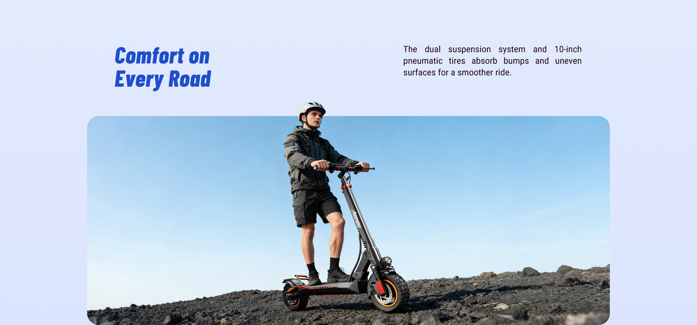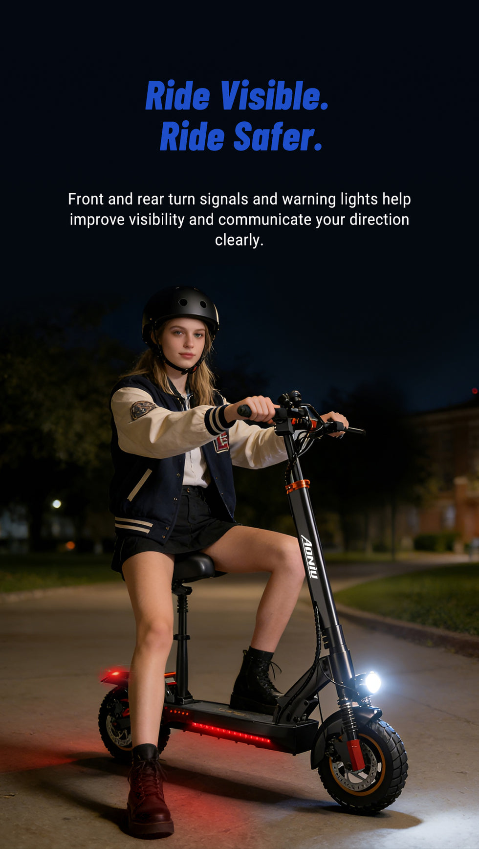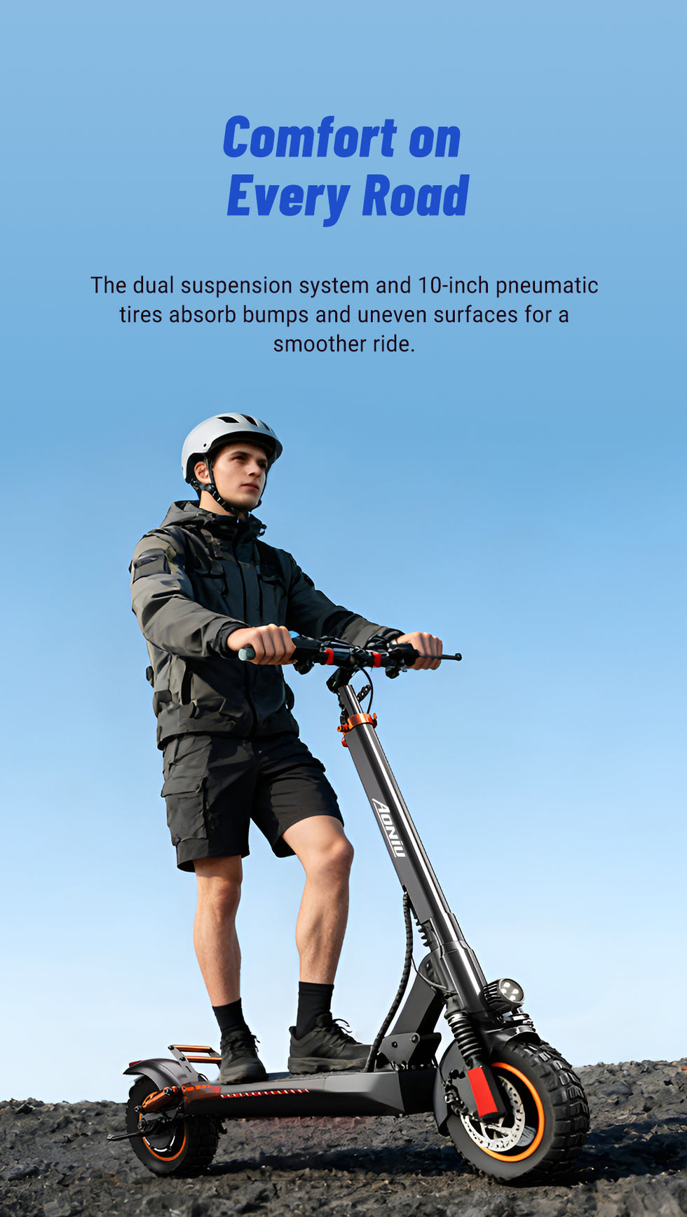 10inch Off road Pneumatic Tires: Aoniu electric scooter is equipped with 10inch Pneumatic tires and front wheel double damping system todeliver smooth ride - even on rough surfaces. The seat on this electric scooter can be detached if you prefer to stand while riding. It holds up to regular use all-terrains roads.