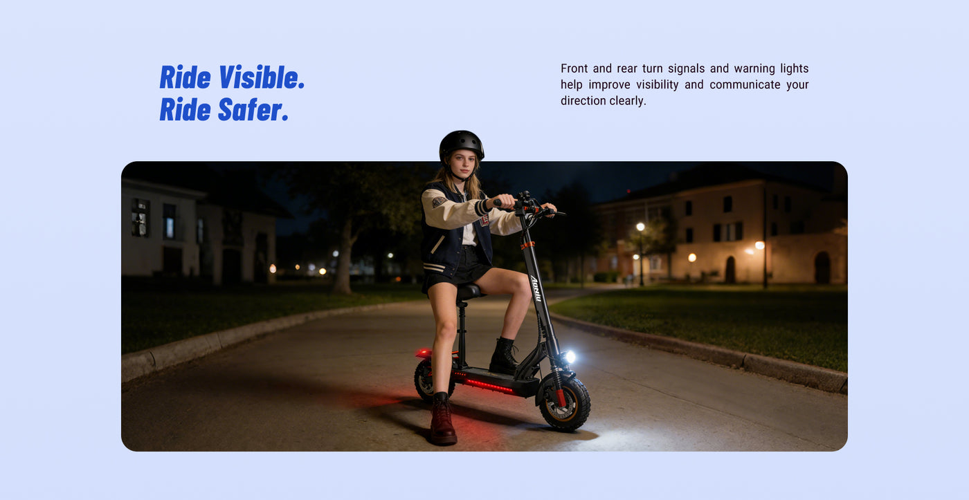 Dual Brake System, Led Headlights: With the features of dual disc brakes on both wheels, equipped with integrated lights. Users feel the safety and comfort of riding, and the integrated design of the running headlight and warning tail light makes the scooter easier to control.